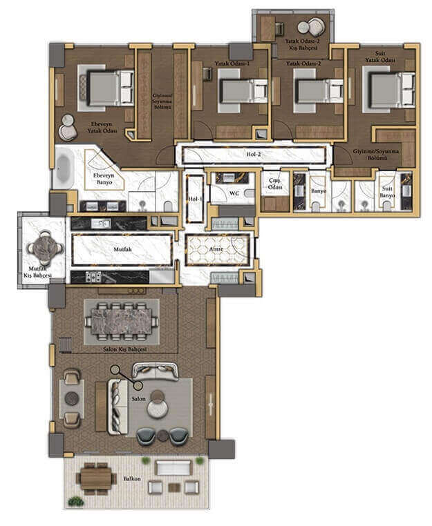 در بویوکیالی، از کف پوش ها و کابینت ها گرفته تا مبلمان و جزئی ترین متریالها همگی با امضای FENDI هستند.